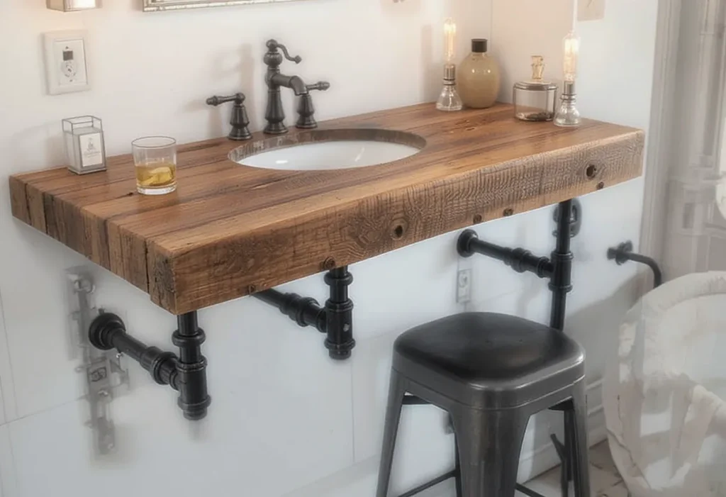 An industrial pipe vanity is best when you want a bold, edgy look with strong structure. The mix of raw metal and wood gives it character and durability that’s hard to beat. It’s sturdy enough to last and totally stands out visually. Approximate cost is $70–$120, making it a moderately expensive but statement-worthy setup.
