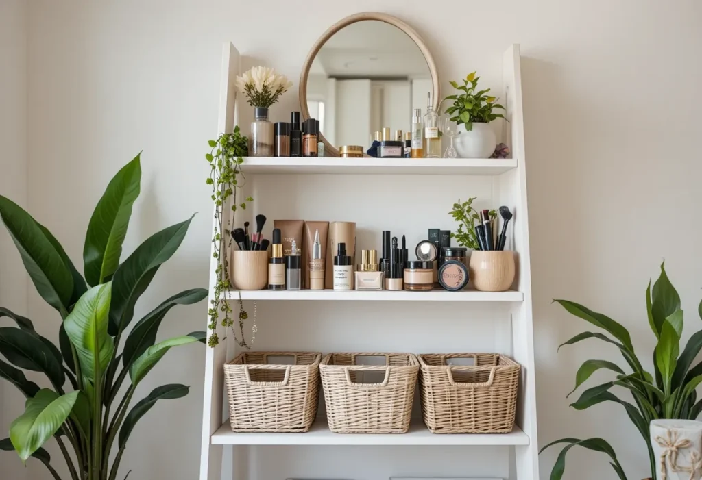 A ladder shelf vanity is best when you want vertical storage that doubles as decor. The angled structure gives it visual interest, and you can use every tier to store and display your beauty items. It’s functional and looks boutique-chic. Approximate cost is $60–$100, so it’s a moderate investment that pays off.