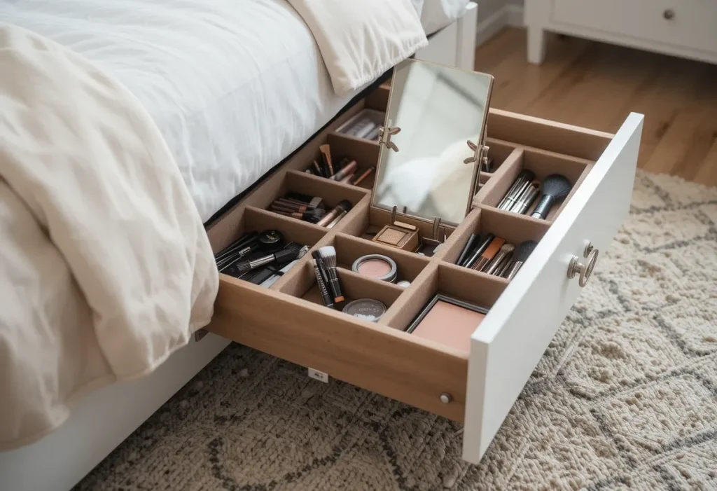 This idea is best when you’re working with limited room but want to keep your beauty setup close. Using a rolling drawer or cart under your bed hides the clutter and gives you a clean aesthetic. It’s smart, subtle, and portable. Approximate cost is $30–$60, so it’s a cheap and clever fix.