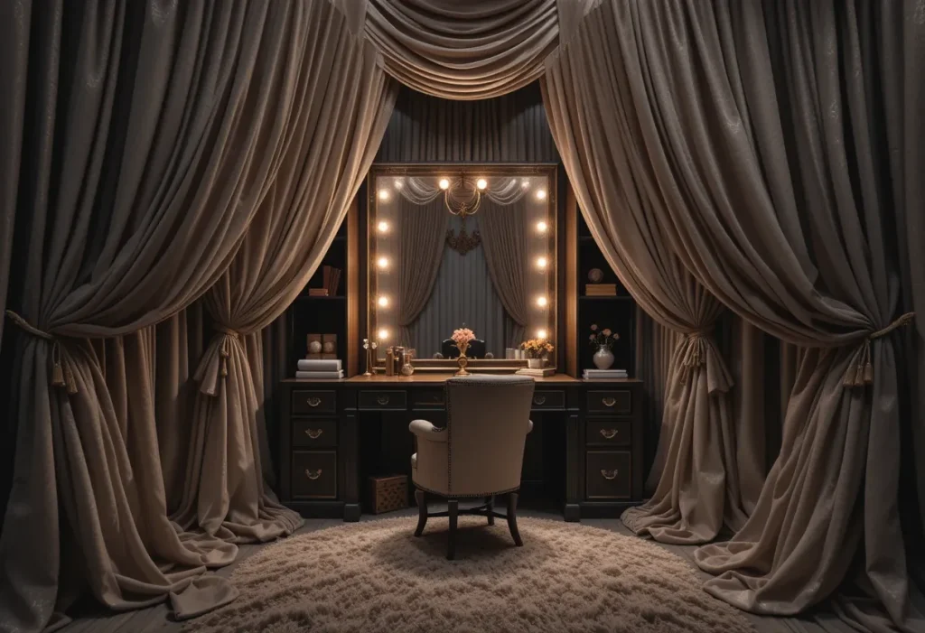 This idea is best when you want privacy and a touch of drama. Installing curtains around your vanity area lets you hide the mess and create a cozy glam nook. It’s flexible and theatrical in the best way. Approximate cost is $50–$100, making it a moderately priced and fun solution.