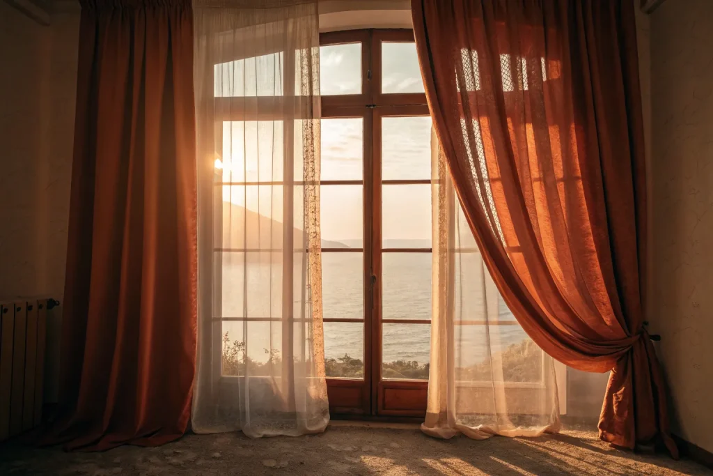 Layered curtains combine function and style by pairing sheer panels with heavier drapes. This setup provides flexibility in light control and adds texture depth. Expect to spend $50–$150 for both layers, making it a mid-range investment. In fall, the heavy layer offers insulation against cool drafts. Visually, the layered effect creates a plush, finished look.