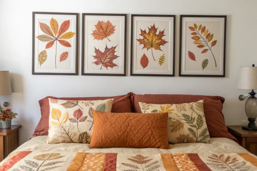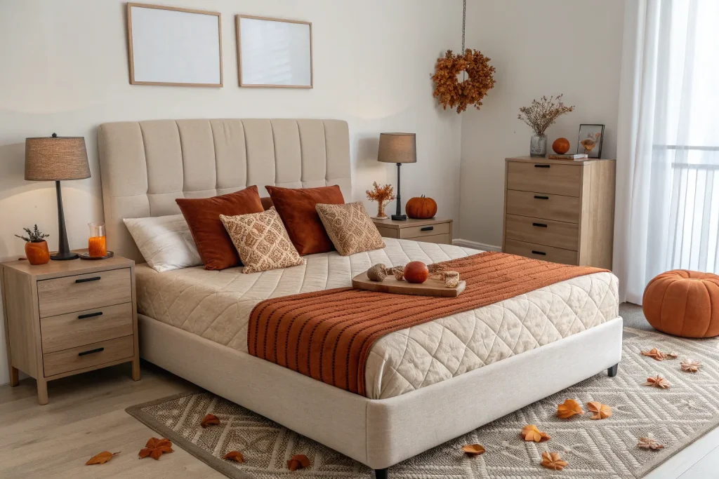 Burnt orange accents are a fall staple, instantly warming up the room. Add them through pillows, throws, or lampshades for quick impact. Costs vary from $15–$60 depending on items, making it cheap to mid-range. This bold color pairs beautifully with browns, creams, and deep greens. It’s an effortless way to refresh your bedroom for the season.