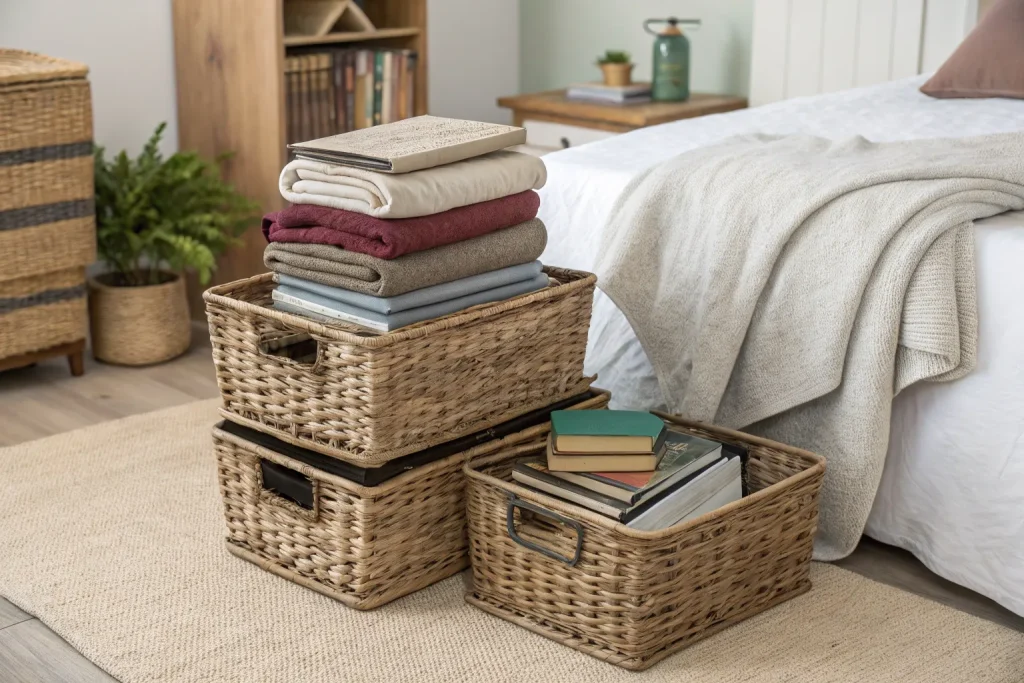 Wicker or rattan baskets are both decorative and functional for fall bedroom storage. They add an earthy texture that blends seamlessly with seasonal decor. Prices range from $15–$60, making them a cheap to mid-range investment. Use them to store blankets, books, or extra pillows while enhancing the room’s style. Their portability makes them easy to move and repurpose.