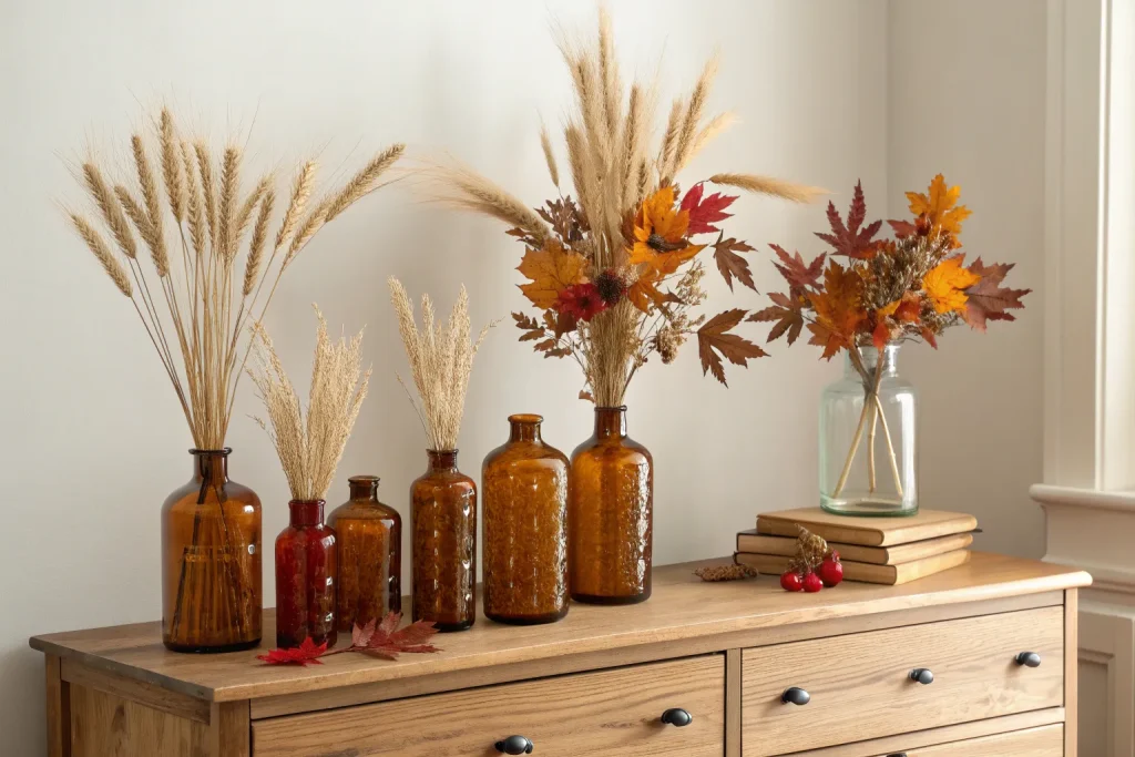 Amber glass vases bring a warm, vintage charm to your fall bedroom decor. They look stunning filled with dried flowers, wheat stalks, or branches. Prices range from $15–$50, making this a cheap to mid-range option. Their golden tones catch the light beautifully, enhancing the cozy atmosphere. They’re versatile enough to work in multiple rooms when the season changes.