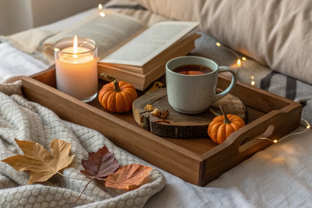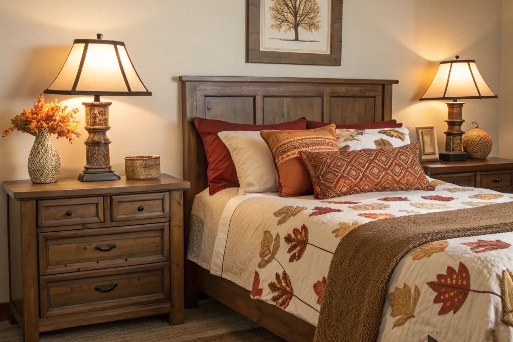 Wooden accents bring warmth and a rustic touch to any fall bedroom, making the space feel grounded and natural. Items like wooden trays, side tables, or headboards instantly upgrade your decor without being overpowering. Costs range from $30–$200 depending on the piece, making this a mid-range to expensive option. The beauty of wood is its timelessness it works year-round while fitting perfectly into a fall theme. Natural textures also balance the softness of fabrics.