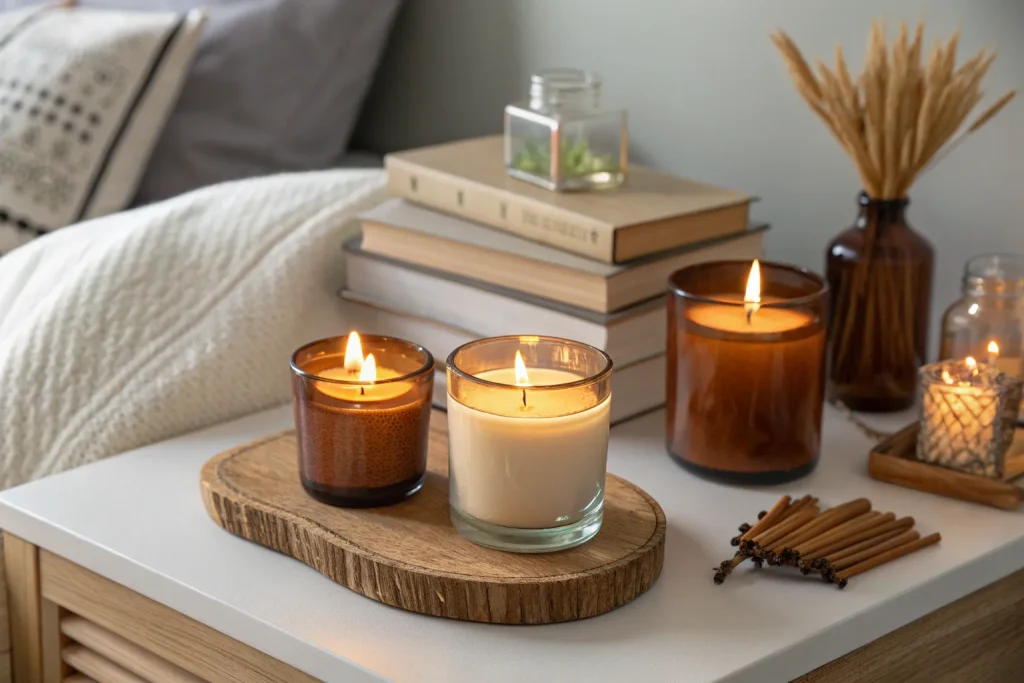 Fall-scented candles instantly set the seasonal mood by filling the air with warm, inviting aromas. Scents like cinnamon, vanilla, and amber create a comforting ambiance perfect for chilly evenings. Prices range from $10–$40 per candle, making this a cheap to mid-range decor boost. Beyond fragrance, candles double as a soft lighting source. This small addition can transform your bedroom’s atmosphere with minimal effort.