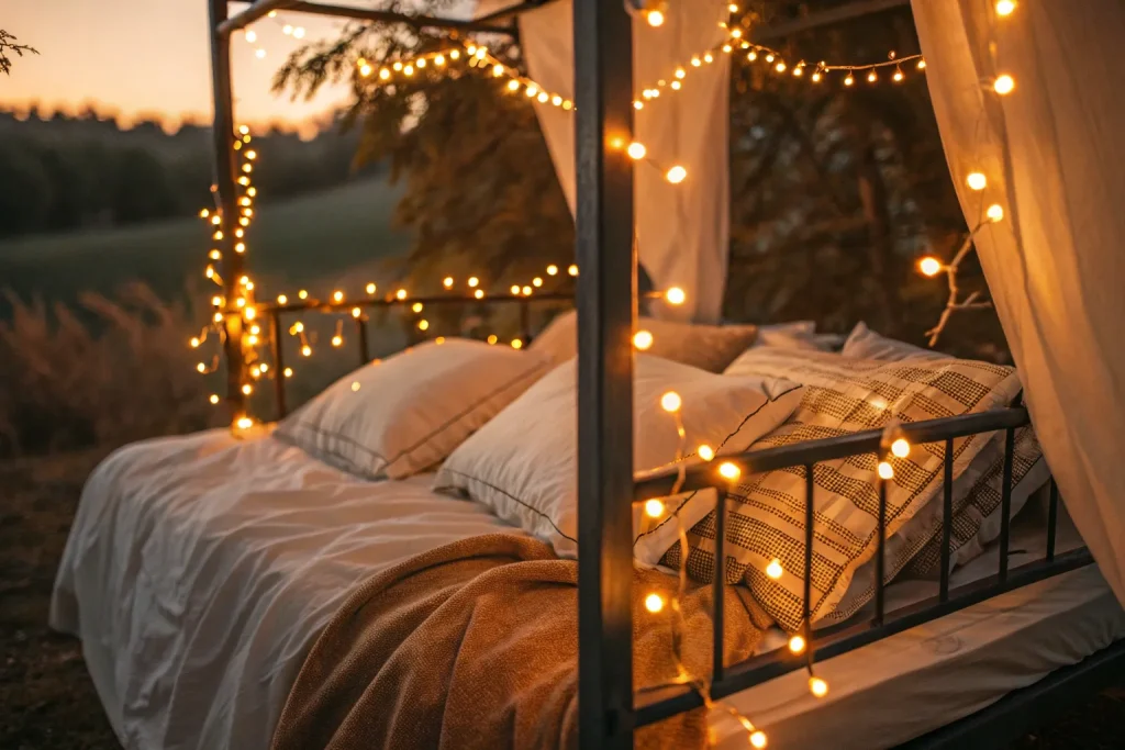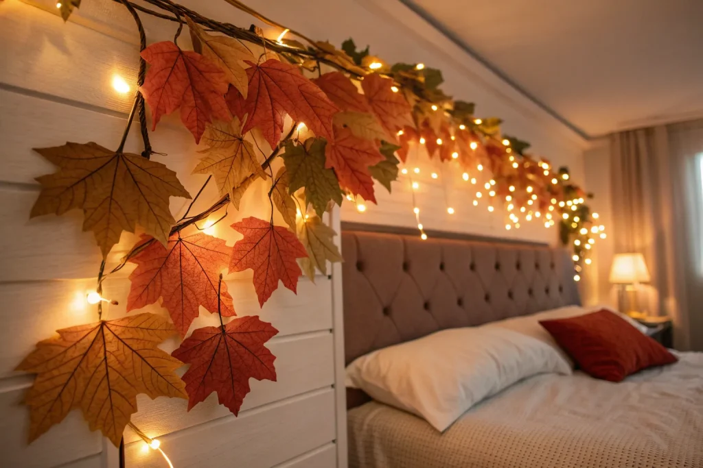 String lights provide a warm, golden glow that perfectly complements fall evenings. Swapping white bulbs for amber-toned ones creates a cozier atmosphere instantly. With prices from $10–$30, this is a cheap yet high-impact decor upgrade. They can be hung around bed frames, shelves, or windows to add depth and light. The result is a bedroom that feels soft, inviting, and seasonally on point.