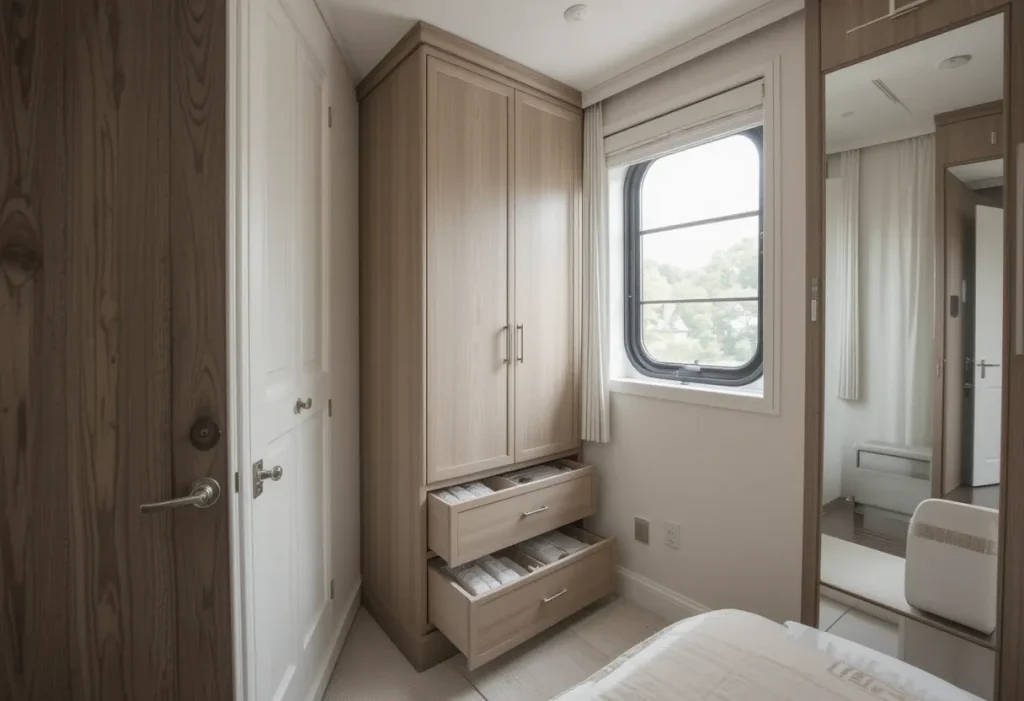 When floor space is limited, going vertical with a tall, slim wardrobe is the smartest trick. It fits into narrow corners and makes use of vertical real estate most people forget. Add drawers at the bottom and you’ve got extra storage for socks, underwear, or accessories. This unit looks tidy and is highly functional without dominating the room. It costs around $150–$250, making it a cheap and efficient idea.