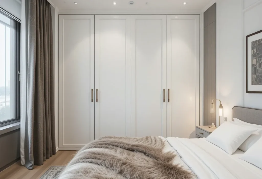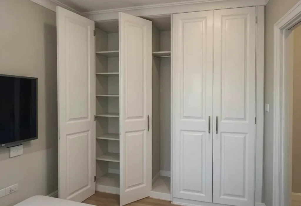 Bifold doors are a genius fix when there’s not enough space for full-swing doors but you still want everything hidden. These compact folding doors give access to wide sections without hogging floor space. A bifold wardrobe can be customized inside with drawers, shelves, and rails. It’s tidy, stylish, and very adaptable for awkward layouts. Approximate cost is $250–$400, so it’s a moderately cheap option.