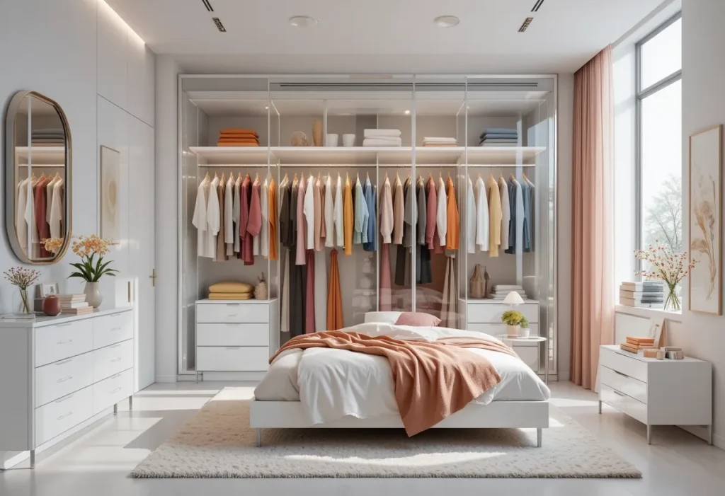 If you’re proud of your wardrobe, why hide it? A clear glass wardrobe lets you showcase your favorite clothes while keeping everything clean and dust-free. It adds elegance and structure to the room instantly. The price falls around $300–$600, so it’s definitely on the expensive side.