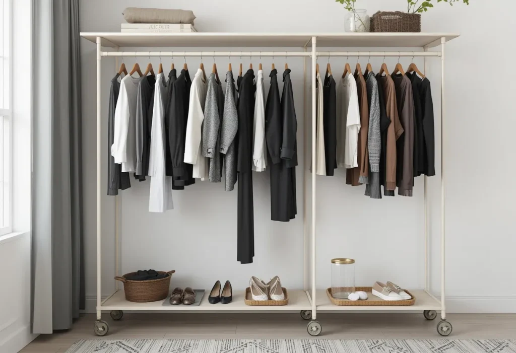 Double-rail systems double your hanging space in the same footprint. One bar goes up high, one lower—perfect for shirts, pants, and more. It’s efficient, easy to assemble, and fits inside closets or on open walls. Expect a cost of $60–$100, making it a cheap win.