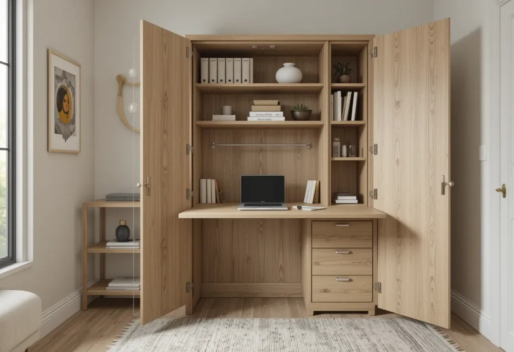 Combine storage and functionality with an armoire that includes a fold-out desk. This hybrid piece is perfect for small bedrooms doubling as a workspace. It keeps clutter hidden and gives you a tidy, multi-functional setup. The price is around $250–$450, placing it in the moderate to expensive range.