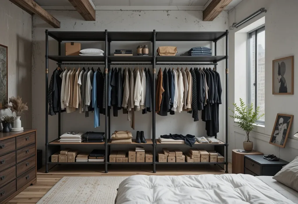 An industrial pipe wardrobe adds a serious edge to your small room with raw metal and open storage. It’s trendy, customizable, and surprisingly budget-friendly. You can DIY or buy ready kits depending on style. Prices range from $100–$200, placing it in the cheap to moderate bracket.