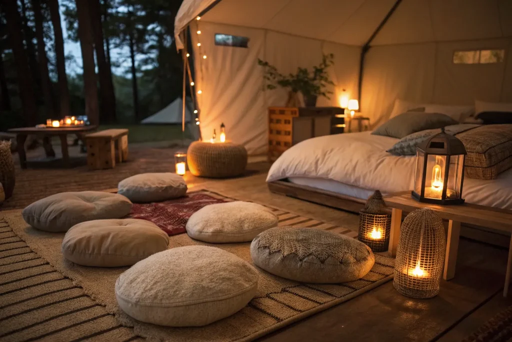 Floor cushions add relaxed seating and give the room an informal cozy feel. They’re perfect for lounging or extra seating when needed. The cost is about $40–$120, which is cheap compared to chairs. They’re flexible and easy to move around.