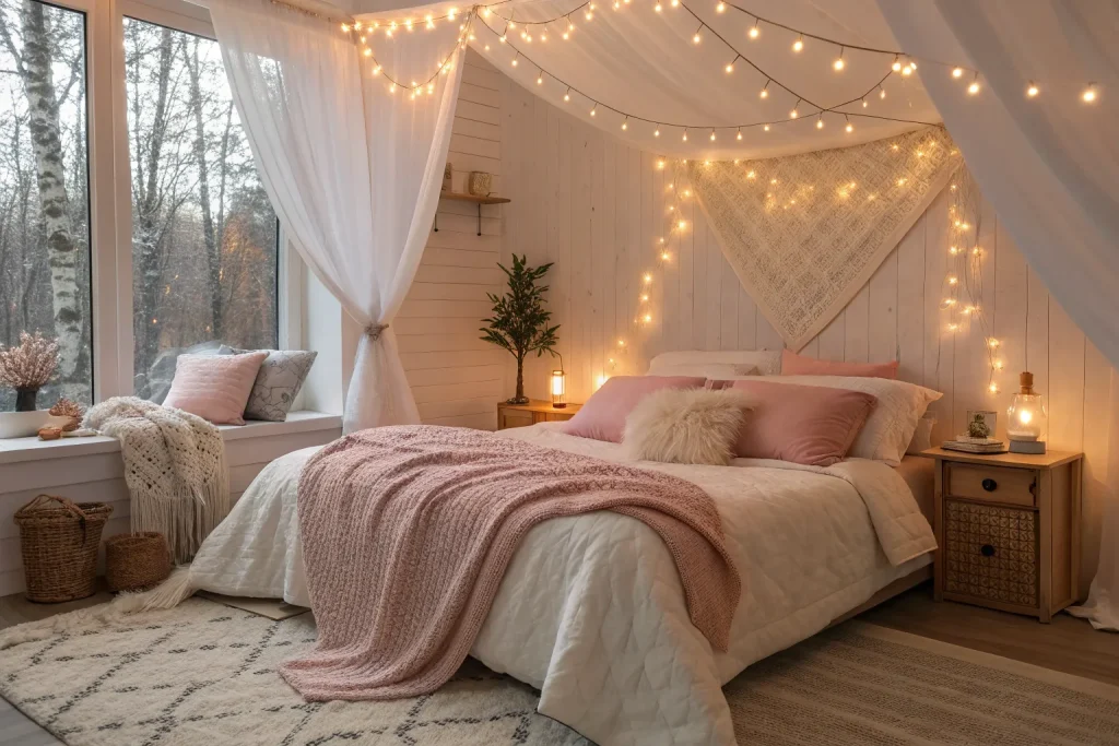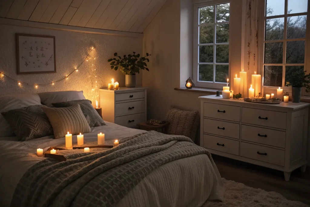 Lighting controls the entire mood of your room, and warm tones create a calming, cozy vibe. Harsh white lights ruin relaxation, while soft yellow glows invite comfort. You can achieve this for about $30–$100, which is cheap and very practical. It’s one of the fastest fixes for creating a cozy retreat.