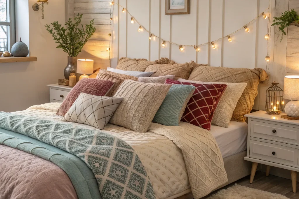 Throw pillows add instant softness while giving your bed a styled look. Different sizes and fabrics prevent the bed from looking flat. This idea costs about $40–$120, which is cheap and easy to switch seasonally. It’s the fastest way to refresh your bedroom without commitment.