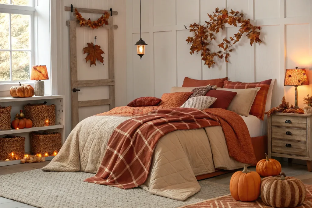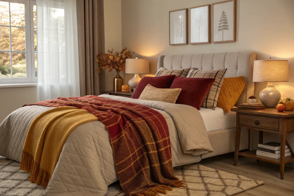 Nothing screams cozy like piling on layered blankets and chunky throws. The mix of textures gives your bedroom that instant fall vibe without a big budget. A good set can cost between $50–$150, making it a relatively cheap upgrade that transforms the room. Plus, you’ll thank yourself on chilly nights.