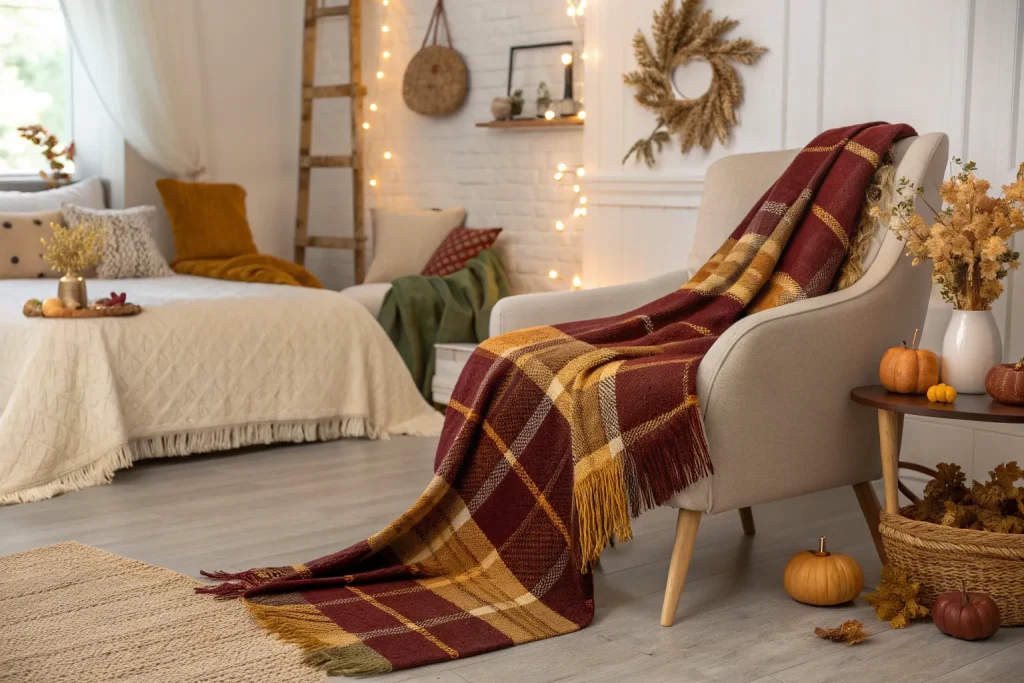 Nothing says fall like a classic plaid throw casually draped on the bed. It gives instant autumn vibes without trying too hard. Costs about $25–$60, so it’s definitely a cheap upgrade. Plaid just never goes out of style, especially in fall.