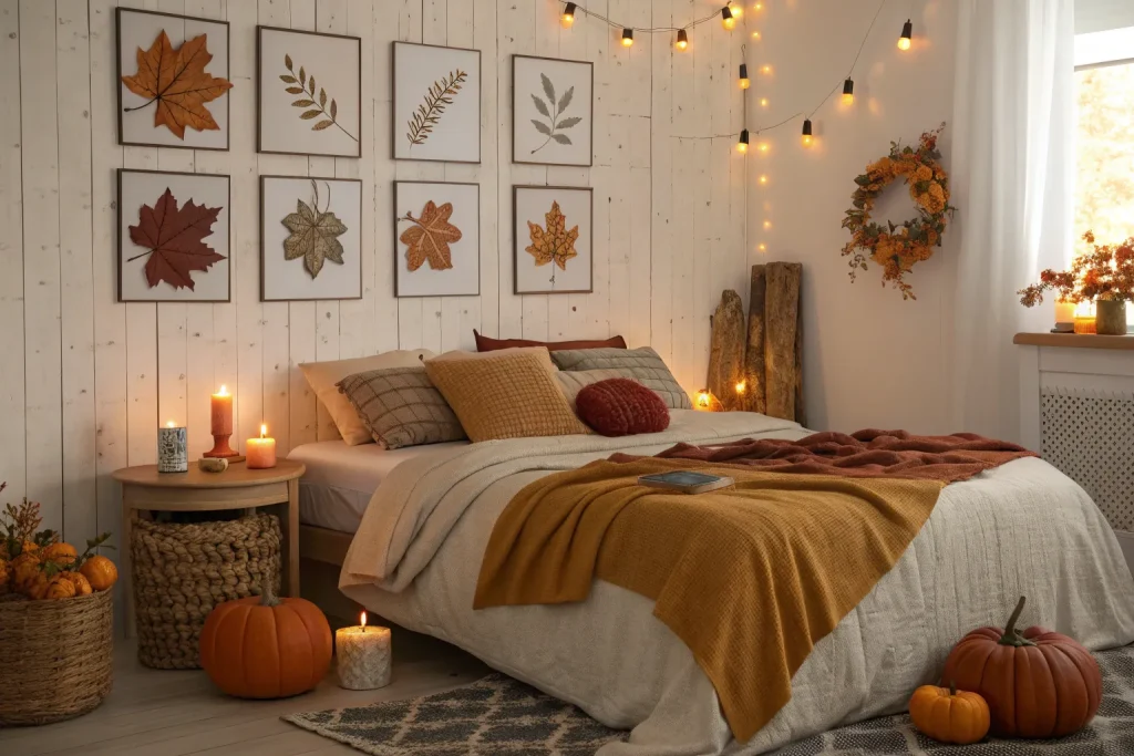 Hang an autumn leaf garland around your headboard or mirror. It’s festive, fun, and cozy all at once. Costs only $20–$50, so it’s cheap and cheerful. Garlands make everything look more intentional.