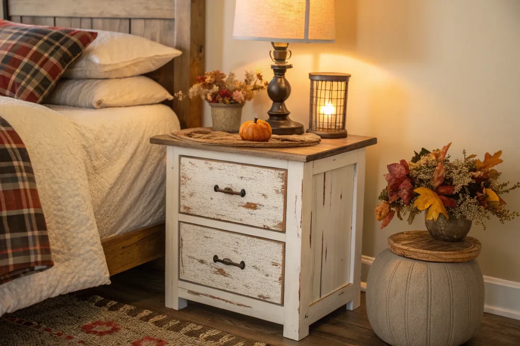 Your nightstand deserves a fall makeover too. Add rustic decor like lanterns, wooden trays, or mini pumpkins. Costs run $30–$90, making it a cheap and fun idea. Small touches make a huge difference.