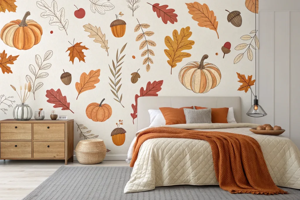 A bold move? Try a fall-inspired wallpaper accent wall. Think warm patterns or muted florals. This costs $150–$400, so it’s expensive, but wow does it transform a space. It’s basically instant fall vibes in one wall.