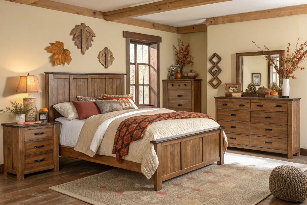 Adding wooden furniture or rustic decor makes a bedroom feel warmer instantly. Think nightstands, shelves, or even a headboard. Prices can range from $150–$500, so this is expensive, but it lasts forever. Honestly, wood just feels like fall carved into furniture.