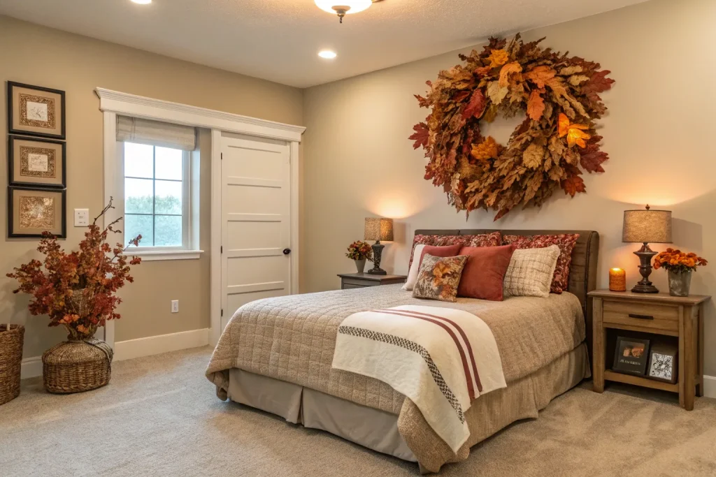 Why keep wreaths on doors when an autumn wreath above the bed looks stunning? It’s a simple statement piece that screams fall vibes. At $40–$90, it’s affordable and unique. Honestly, it’s one of the easiest ways to say, “Yep, this room belongs to fall.”