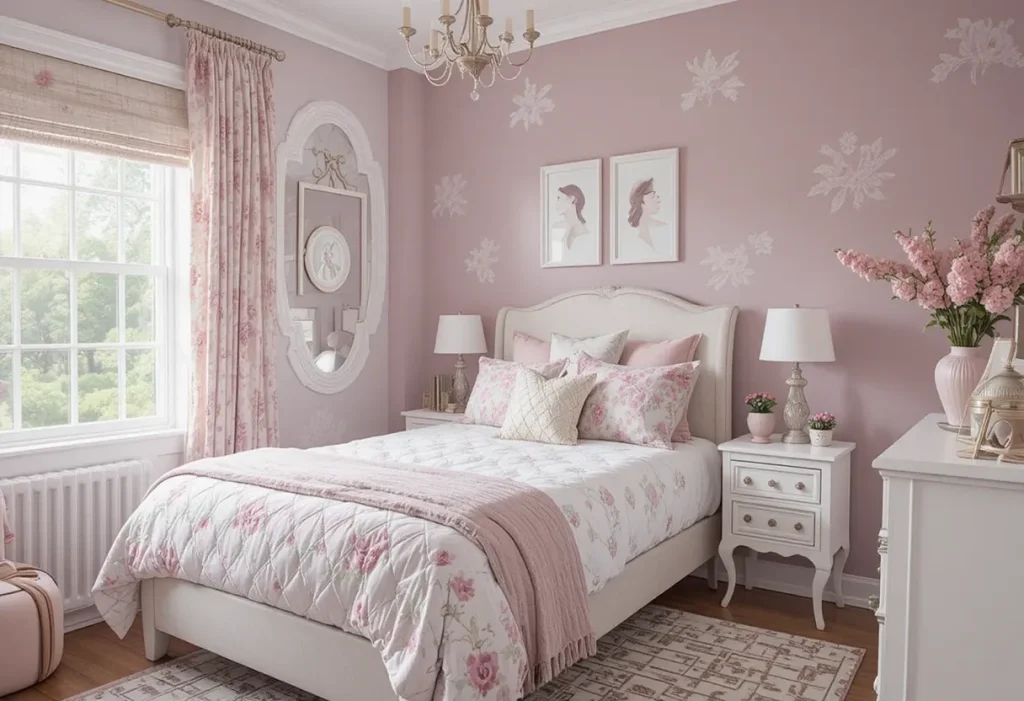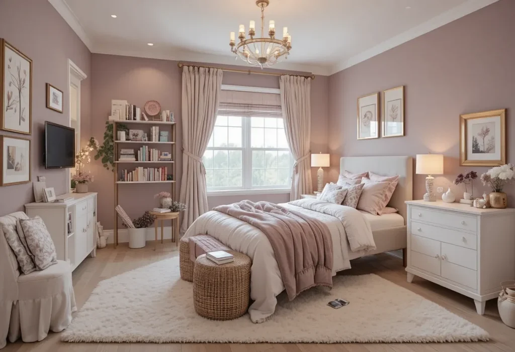 Soft, warm lighting enhances the feminine charm of this palette. Think string lights draped above the bed, rose-gold table lamps, or even a mauve-tinted lampshade. Lighting creates mood, making the room a personal retreat for reading, studying, or simply relaxing.